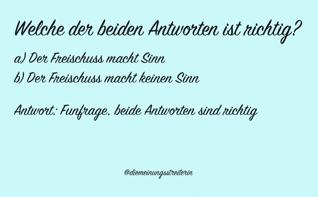 Wir Menschen sind alle unterschiedlich. Wir haben verschiedene Temperamente, verschiedene Charaktere, unterschiedliche Erfahrungen im Leben gemacht, befinden uns in verschiedenen Lebensaltern und haben deshalb nicht die gleichen Bedürfnisse! Für den einen ist deshalb der Freischuss sinnvoll, für den anderen nicht.
