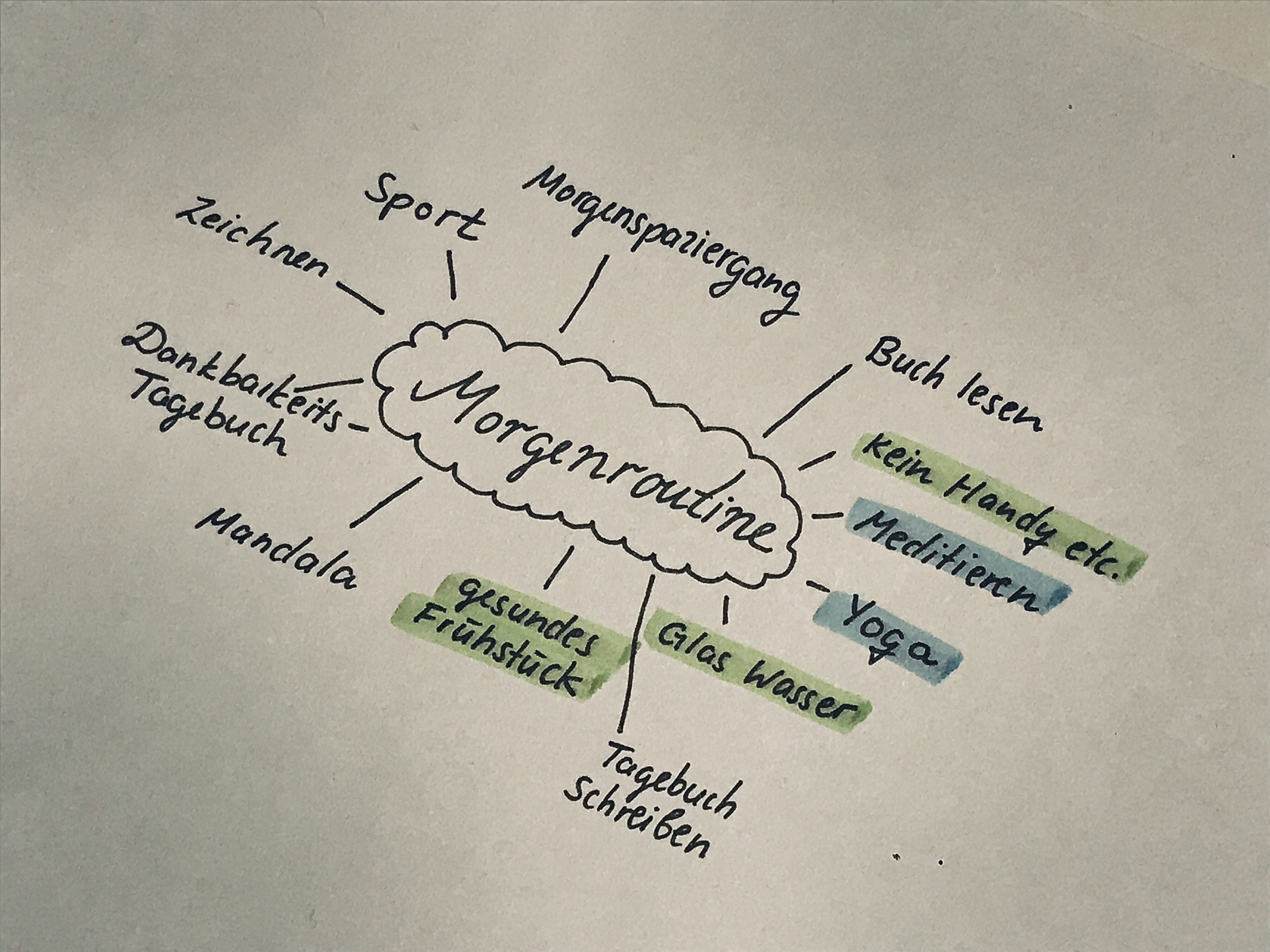 Ich weiß, dass es sehr viele Empfehlungen gibt. Vom Lieblingsbuch lesen und Journaling bis Joggen gehen ist alles dabei. Halte es aber simpel. Jeder von uns hat viel zu tun und selbst wenn mal nicht (ich spreche aus Erfahrung) meist dennoch nicht genug Zeit für eine Morgenroutine, welche über eine Stunde dauert. Reflektiere also für dich selbst deinen Alltag. Sammle Vorschläge, die dir gut tun würden, in Form einer Mindmap. Überlege dir wie viel Zeit du (ernsthaft!) hast. Wie viel könntest du am Morgen machen, dass du deine Morgenroutine durchziehst? Nimm dir einen Textmarker und markiere zunächst in einer Farbe alles was essentiell ist: was ist Pflicht für ein gesundes Leben? Nimm dir eine weitere Farbe und markiere dir alles, was du nun zusätzlich in deine Morgenroutine bringen möchtest.