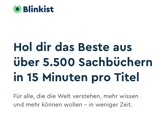 Für wissbegierige Leser mit wenig Zeit kann Blinkist genau das richtige sein. Mit Blinkist kannst du kostenpflichtig ein Buch in nur 15 Minuten anhören/lesen. Die Kernaussagen des Buches werden dabei auf den Punkt gebracht. Praktisch für alle, die gerne neues lernen, aber einfach nicht genug Zeit, Kraft oder Ruhe zum Lesen haben.